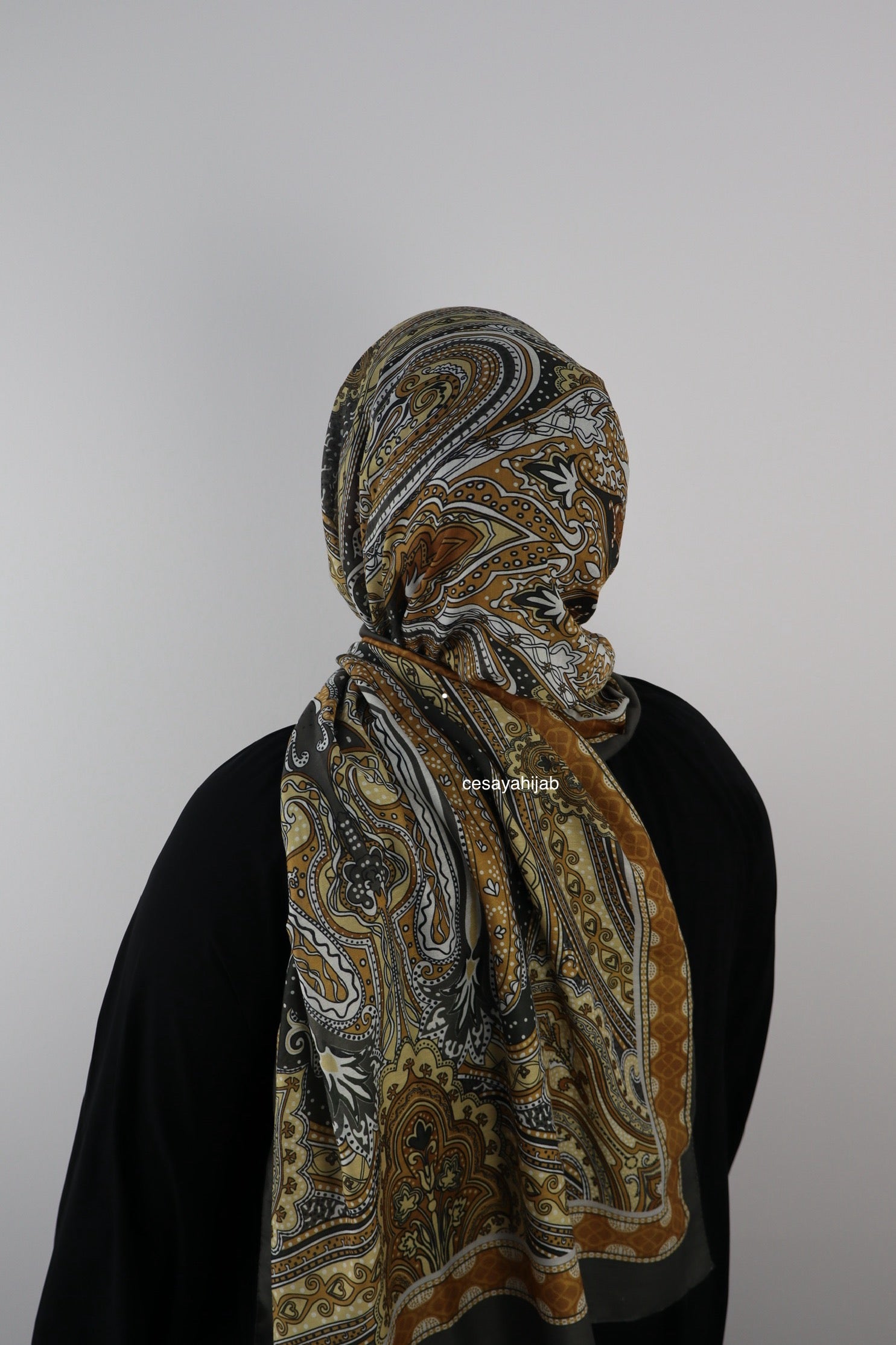 Ein weicher, angenehmer Baumwolle-Hijab mit einem stilvollen ethnischen Design. Leicht, blickdicht und atmungsaktiver Stoff, perfekt für jeden Anlass.